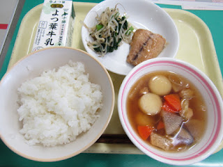 今日の給食は、ごはん、いも団子汁、さばのみそ煮、小松菜ともやしの和え物、牛乳です。