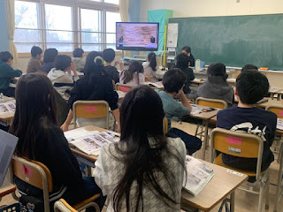 国語は、「ふろしき」という単元を学習しているところでした。風呂敷を使って、いろいろな品物を包んでいる映像を見ていました。見事な包み方に、みんな感心していました。理科は、音の伝わり方について学習しているところでした。3人で糸電話を使いたいときはどしたらよいのか…、しっかり言葉にまとめていました。