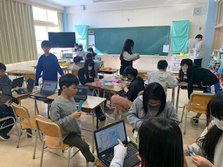 国語は、「お気に入りの場所、教えます」という単元の学習を進めているところでした。自分たちのお気に入りの場所を探し回っていました。場所が決まると、クロームブックで撮影して教室へ戻ります。いいところが見つかったでしょうか?